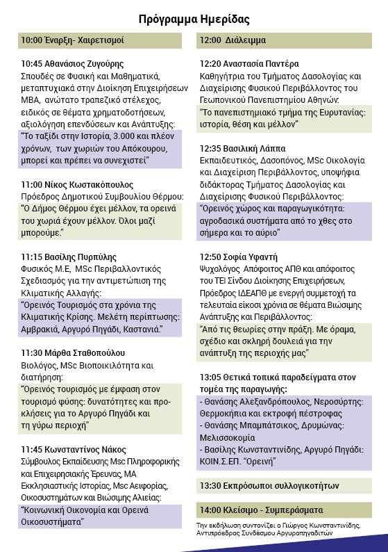 Η υπάρχουσα κατάσταση στην ορεινή περιοχή του Δήμου Θέρμου είναι αυτή που επιβάλλει την πραγματοποίηση της ημερίδας, ως συμβολή στην προσπάθεια συλλογικοτήτων και ενεργών πολιτών για την ανάσχεση της φθοράς και την αναπτυξιακή ανασυγκρότηση της περιοχής.