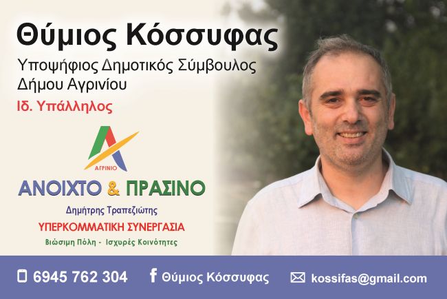 Φίλες και φίλοι, είμαι ο Θύμιος Κόσσυφας και με τους περισσότερους από εσάς γνωριζόμαστε προσωπικά από την κοινωνική συναναστροφή και τους κοινούς αγώνες. Πολλοί με γνωρίζετε από την πολυετή παρουσία μου στο τοπικό ραδιόφωνο και την αρθρογραφία μου στα τοπικά μέσα, εκφράζοντας απόψεις και προβληματισμούς, πάντα με παρρησία, δημόσια και επώνυμα.