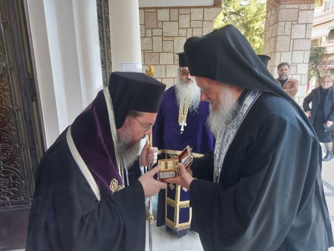 Αρχικά, στα προπύλαια του Ιερού Ναού, ο Σεβασμιώτατος Μητροπολίτης Αιτωλίας και Ακαρνανίας κ. Δαμασκηνός, επικεφαλής του ιερού κλήρου και του φιλαγίου λαού, υποδέχθηκε απότμημα του Ιερού Λειψάνου του Οσίου, το οποίο εκόμισε ο π. Μύρων προς ευλογία και επιστηριγμό των πιστών.