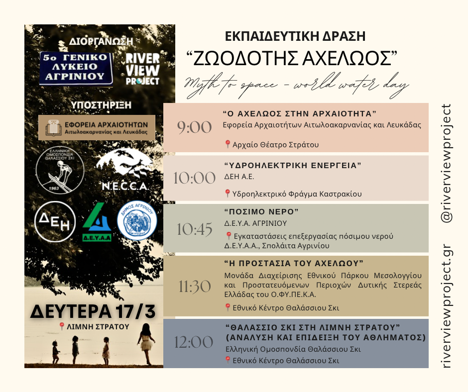 Θα λάβει χώρα με αφορμή τη συμμετοχή μαθητών και εκπαιδευτικών του 5ου ΓΕΛ Αγρινίου στο διεθνές δίκτυο “Myth to space” και την Παγκόσμια Ημέρα Νερού, με την υποστήριξη πολλών Φορέων της Αιτωλοακαρνανίας.